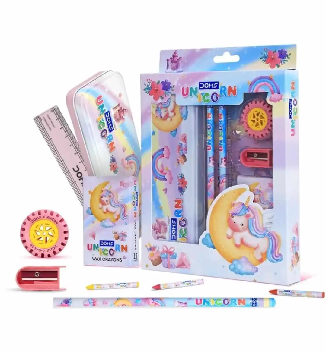 DOMS Unicorn Stationery Kit| Includes 1 Unicorn Compass Box,1 Sports Wheel Shape Eraser, 1 Sharpener, 2 Unicorn Pencils & 1 Pack of 12 Shades Wax Crayons| A Beautiful Gift for Children