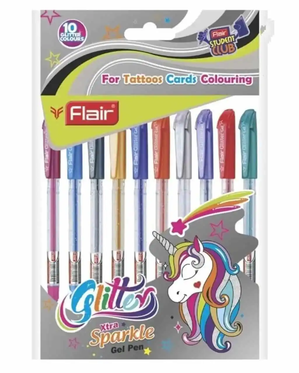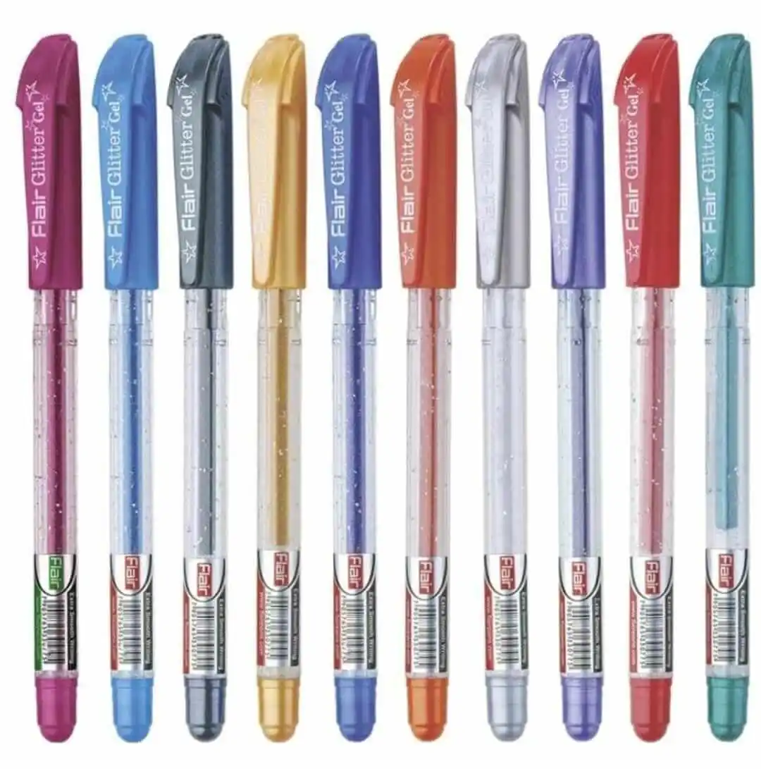 FLAIR Glitter Sparkle 1.0mm Gel Pen Blister Pack | Smooth & Perfect Writing Experience | Non-Toxic Fluid Gel Ink | Beautiful Transparent Body With Sparkles | Set of 10 Different Ink Colors